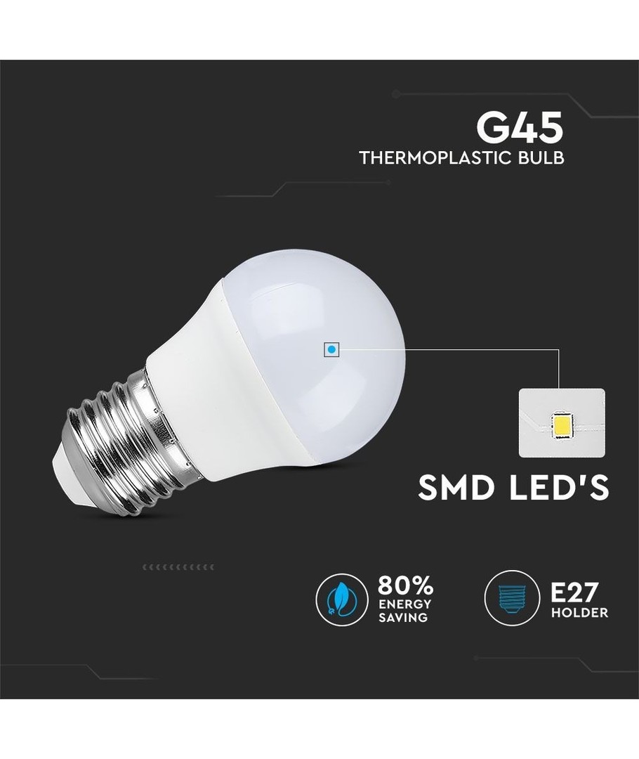 4W LED pæren med en E27 stor fatning er en energibesparende løsning, der er et ideelt alternativ til traditionelle 30W pærer. Dens kompakte G45 design betyder, at den passer perfekt selv i mindre armaturer, uden at gå på kompromis med lysets kvalitet eller effekt.