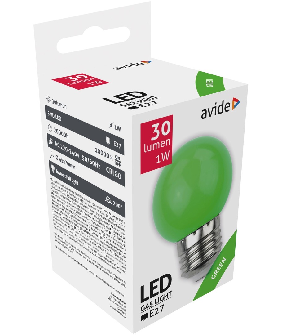 På trods af dens beskedne 1W forbrug, tilbyder denne kronepære en lysstyrke på 30 lumens. Dens imponerende 200 graders spredning sikrer en jævn fordeling af lys, som fylder rummet med behagelige grønne nuancer uden skarpe skygger.