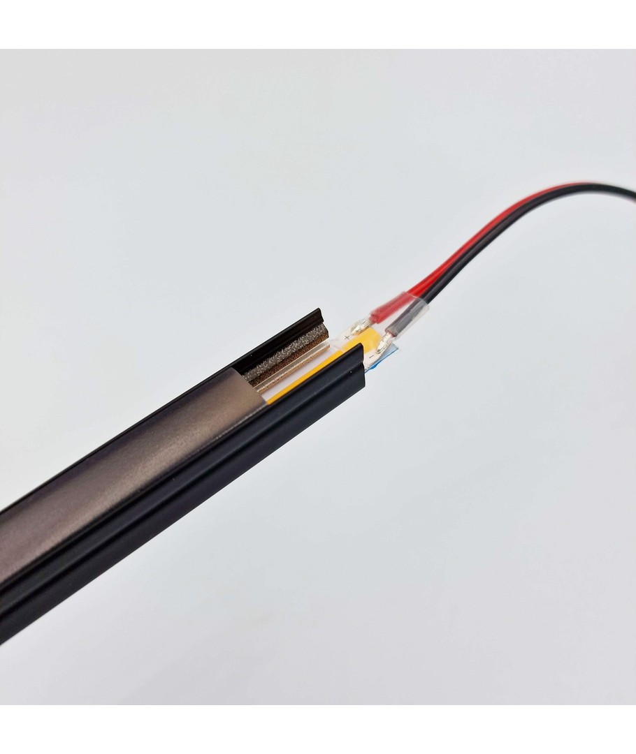 Den sorte aluprofil monteres nemt mellem lamellerne på akustikpanelerne, hvilket skaber et gennemgående ensartet og stilfuldt look. Den 2 meter lange ledning gør det let at tilslutte strippen til en 24V strømforsyning. Vælg en passende strømforsyning baseret på antallet af meter LED strip, du har brug for. Husk også at overveje en dæmper for justerbar lysstyrke.
