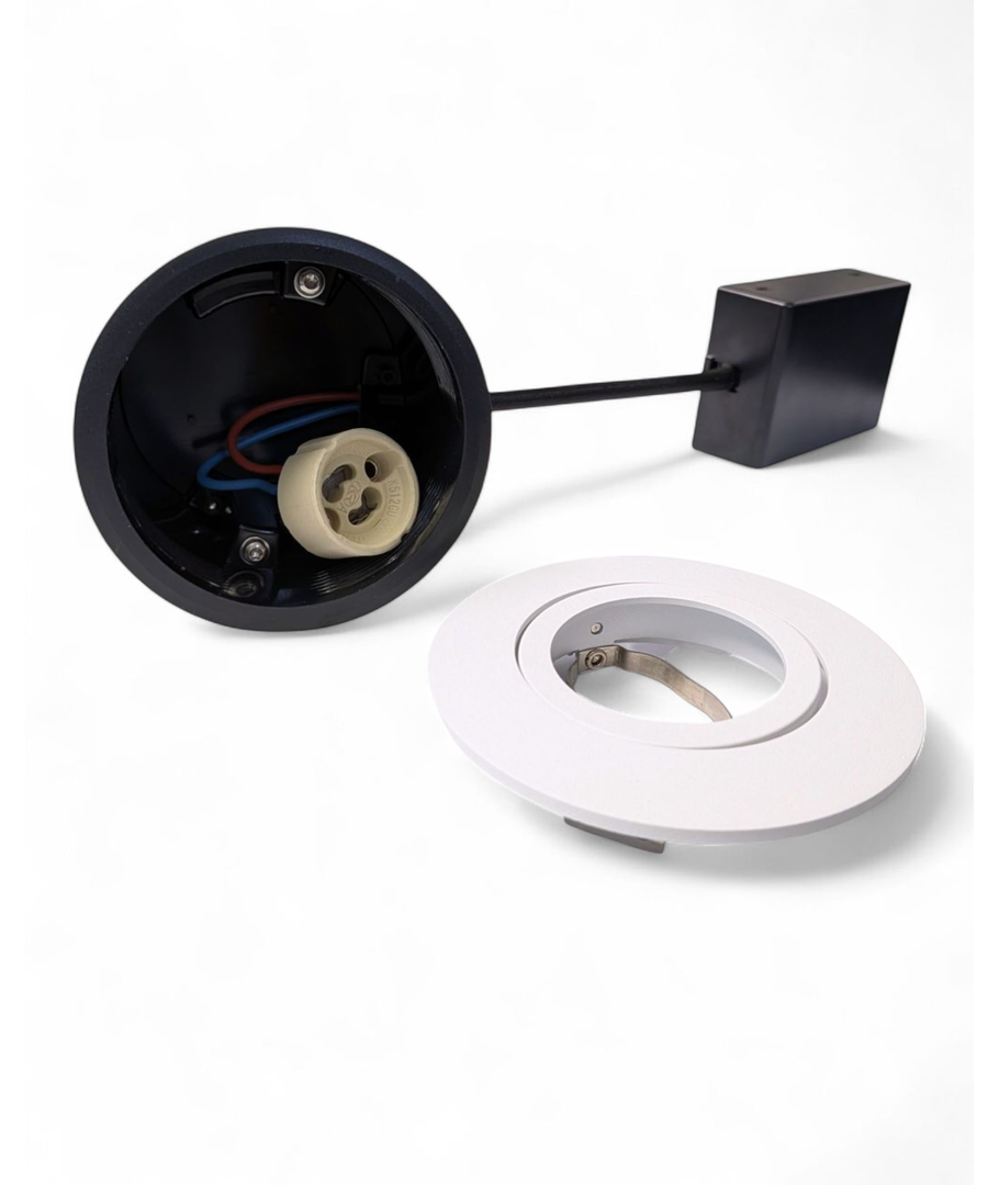 Super flot og stilren indbygningsspot som leveres uden synlig fjeder der fastholder lyskilden, da den monteres fra bagsiden af den synlige del af fronten. Spottet er kipbar ca. 35 grader. og der er plads til en LED GU10 pære med MAX længde på 57mm med ben.