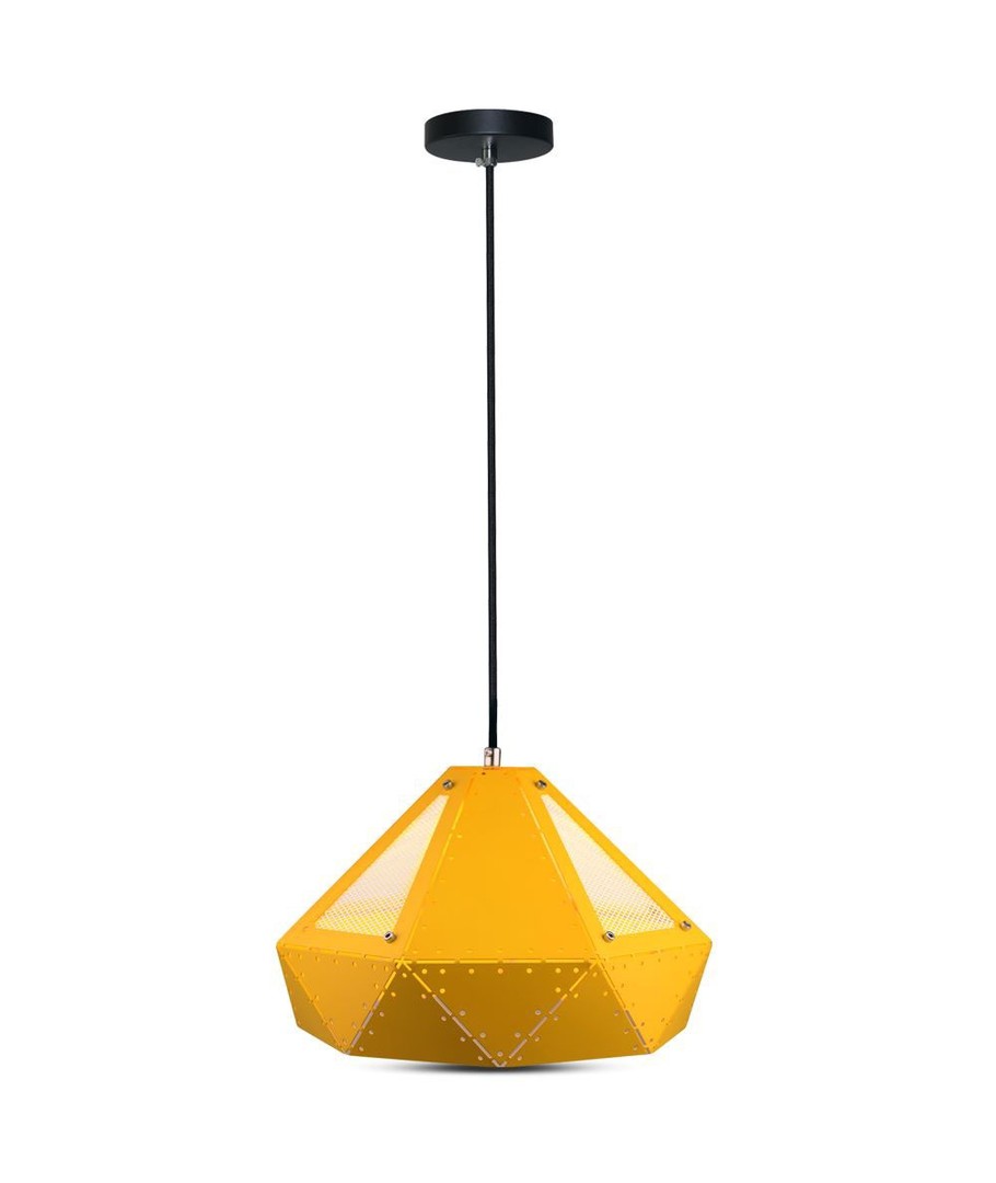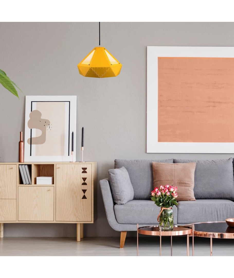 Den iøjnefaldende gule nuance af lampeskærmen tilføjer en livlig og frisk tonalitet, der komplimenterer moderne indretningstendenser. Denne lampe bruger en E27 fatning, hvilket gør det nemt at finde kompatible pærer, som passer til dine belysningsbehov.
