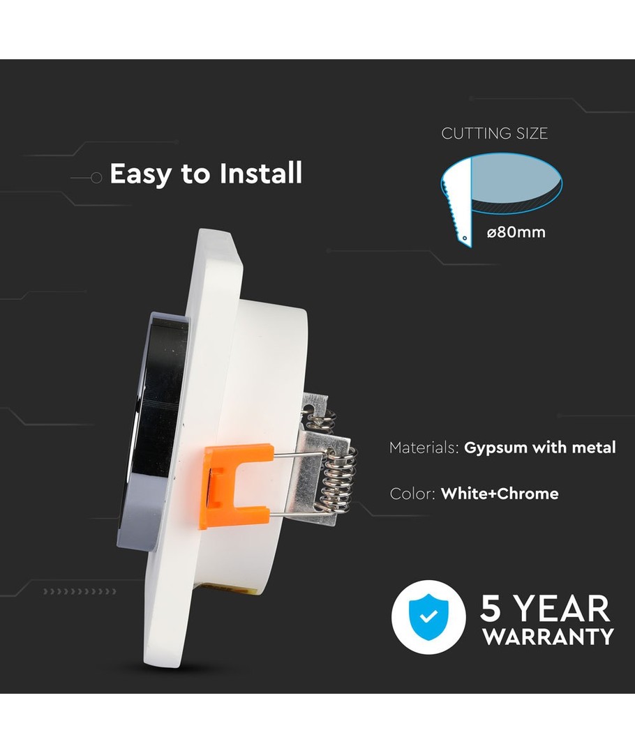GU10 indbygningsspot i gips - Hvid/krom, Hul: Ø8,0 cm, Mål: Ø10 cm, uden lyskilde V-TAC Udvid