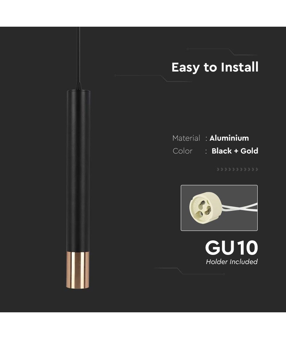 Forvandl dit boligindretning med denne smukke hængende pendellampe fra V-Tac Pro serien. Lampen, med sin sort og guld finish, tilføjer et strejf af luksus og modernitet til ethvert rum.