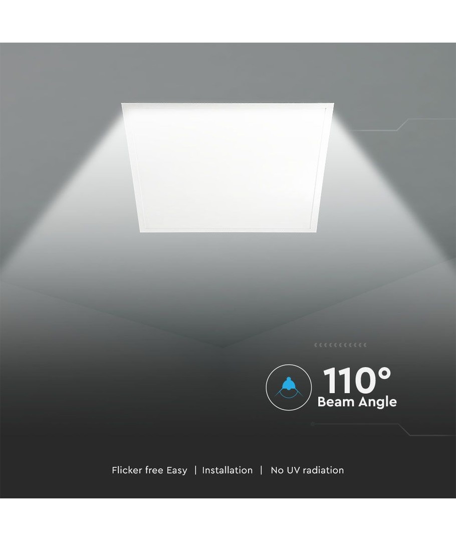 Panelets design på 595 x 33 x 595 mm gør det let at installere i mange forskellige typer loftsystemer. Bemærk, at panelet har en IP20 klassifikation, hvilket betyder, at det ikke er modstandsdygtigt overfor vand og derfor ikke bør anvendes i fugtige omgivelser.