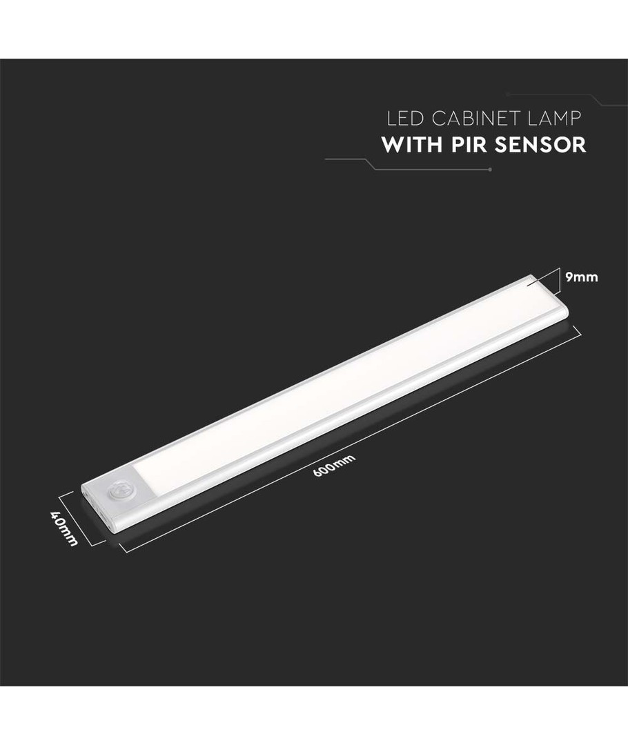 Lyset har et stilrent design med et sølvhus, der let passer ind i de fleste skabsinteriører. Produktets dimensioner er 600 x 9 x 40 mm, hvilket betyder, at det nemt kan monteres uden at optage for meget plads.