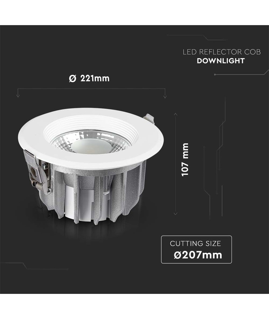 Med dimensioner på 221 x 107 mm og en hul størrelse på 207 mm, passer denne downlight til en bred vifte af indbygningsapplikationer. Dens integrerede lyskilde gør installationen både nem og hurtig.