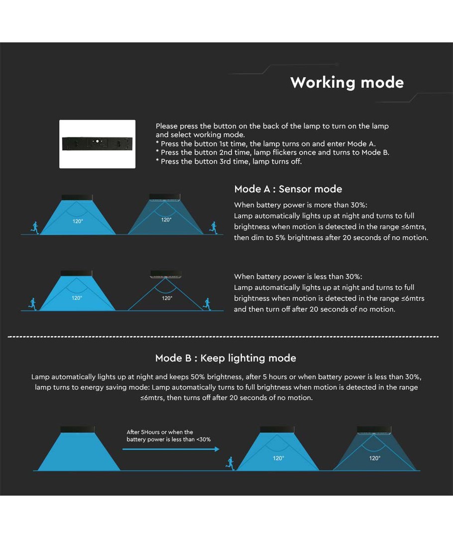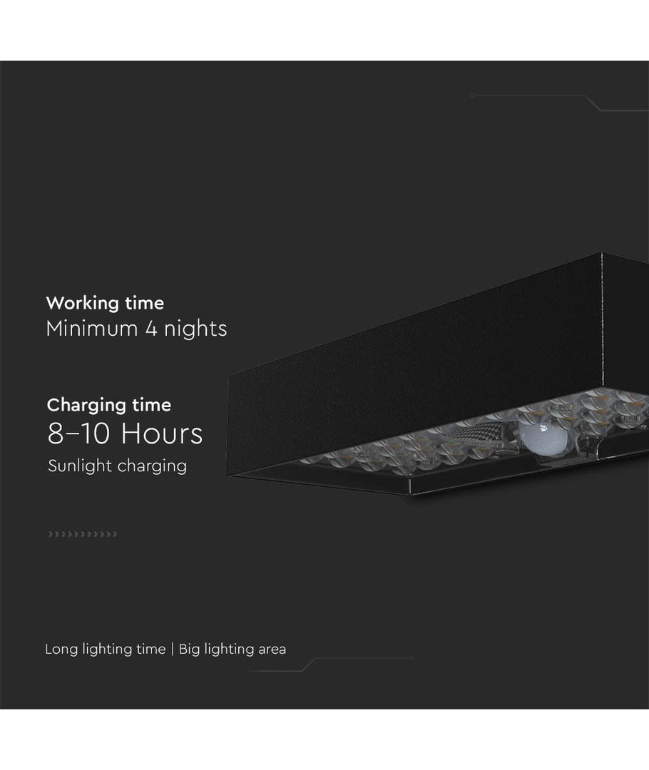 | Yderligere bemærkninger | Battery: 3.7V, Lithium 3000mAh Battery. Charging time: 8-10 Hours Sunlight Charging. Working time: Min. 4 Nights. Sensor type: PIR. Sensor distance: 6M. |