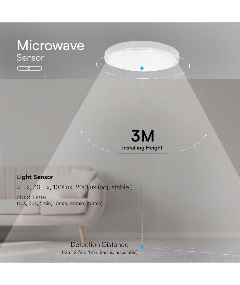 | Yderligere bemærkninger | Light-on duration: 10s, 30s, 5min, 10min, 20min, 30min. Sensor distance: 1-2m,2-3m,4-5m(radius,adjustable). Ambient light level: 5lux,30lux,100lux,200lux(adjustable). |