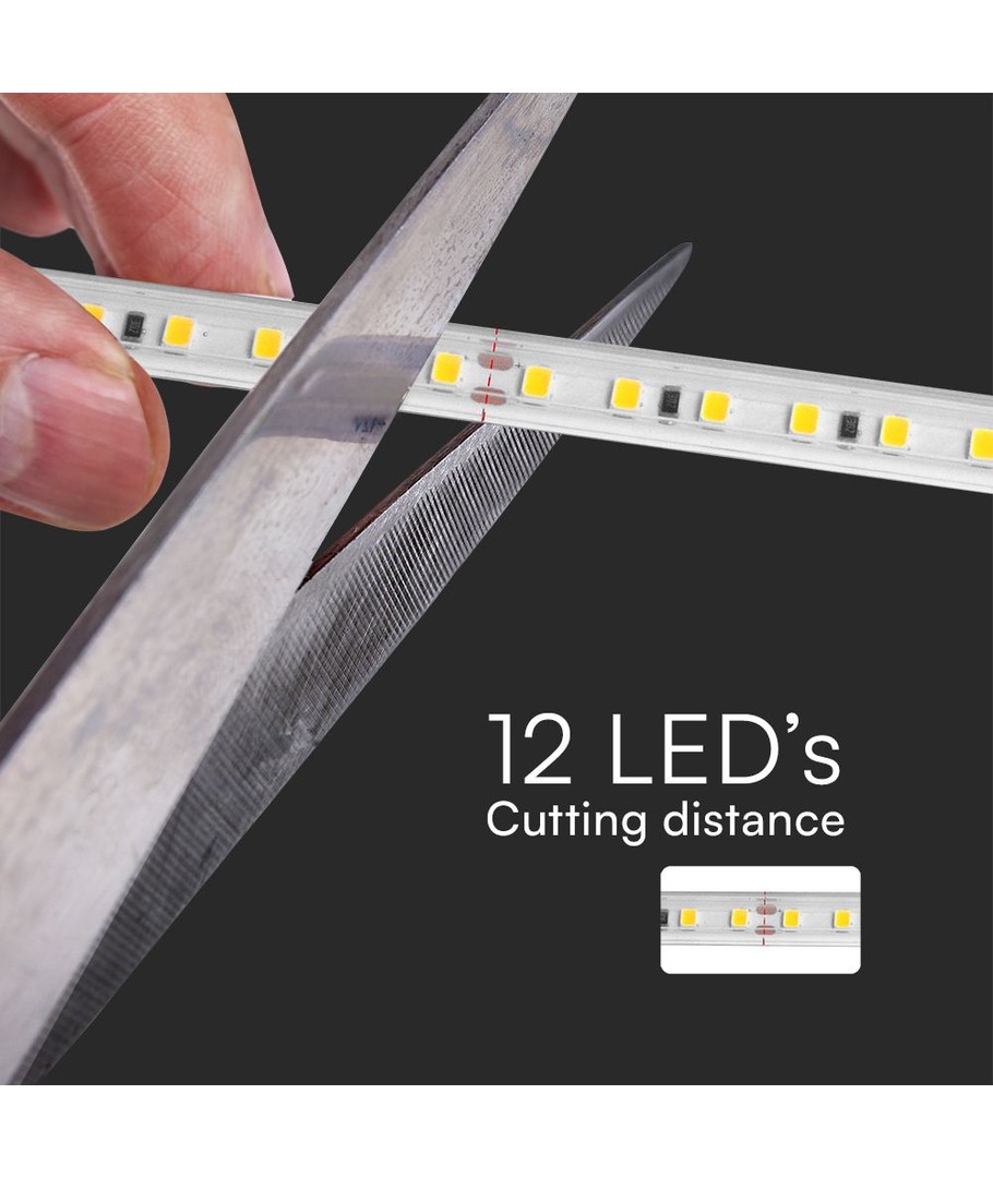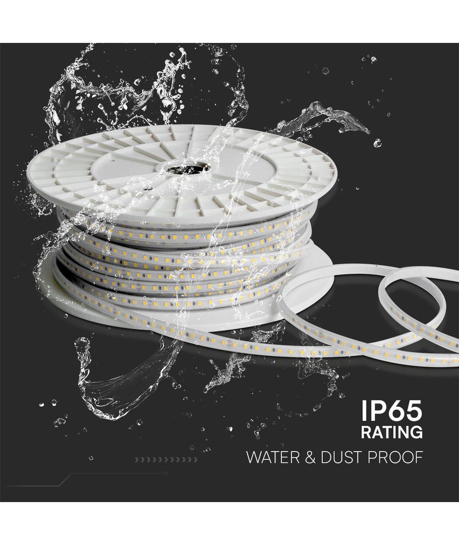 Dette LED-lysbånd er ikke kun kraftfuldt, men også robust. Med en IP65-klassificering står det snildt imod elementerne, hvilket gør det perfekt til både indendørs og udendørs anvendelse. Det kan tåle vandstænk og regn, hvilket sikrer en lang levetid selv under udfordrende forhold.