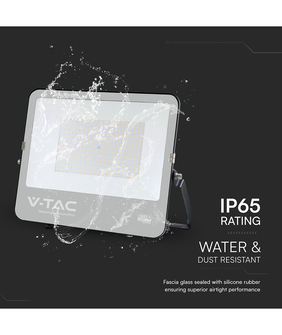 Det robuste sorte hus på projektøren er IP65-certificeret, hvilket betyder, at den tåler vandstænk og regn uden problemer. Dette gør produktet velegnet til udendørs installationer året rundt.