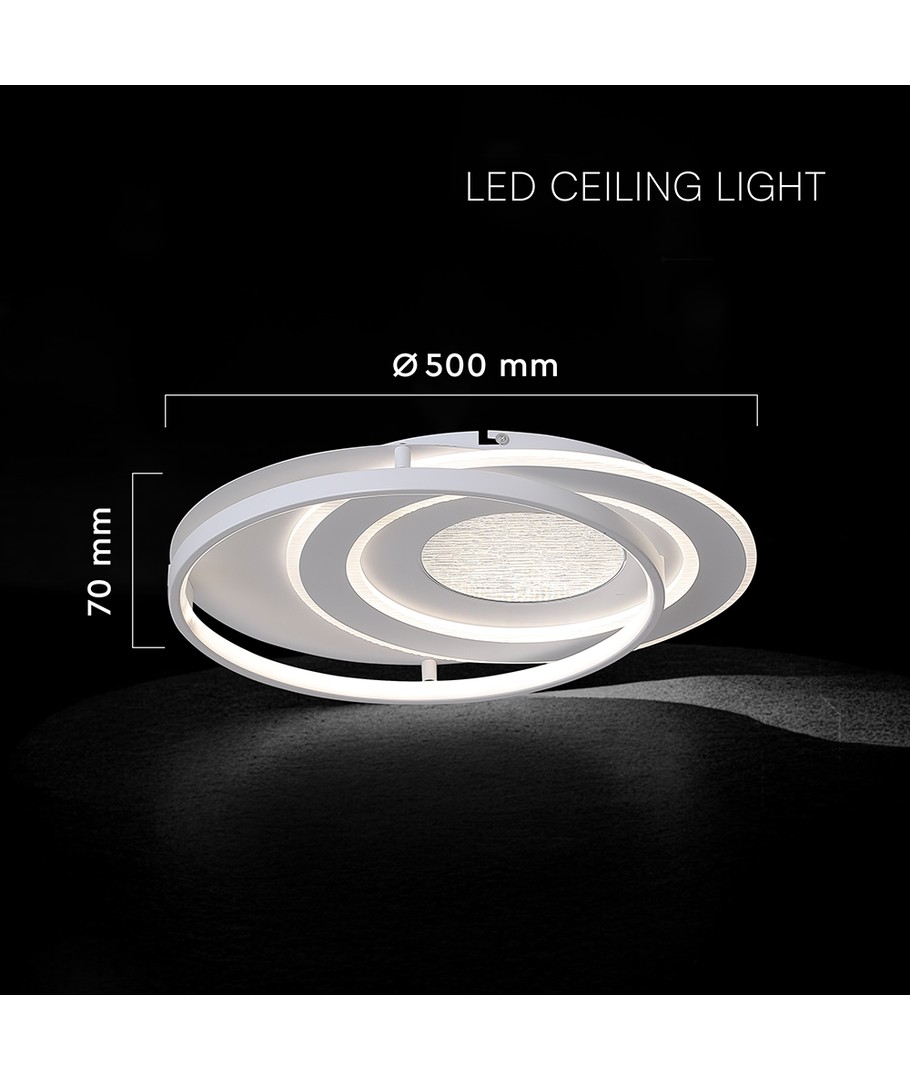 Lampens dimensioner er 500 x 70 x 420 mm, hvilket gør den til en alsidig løsning, der passer til både små og store rum. Dens slanke og stilrene design i hvid integreres let i enhver indretningsstil.