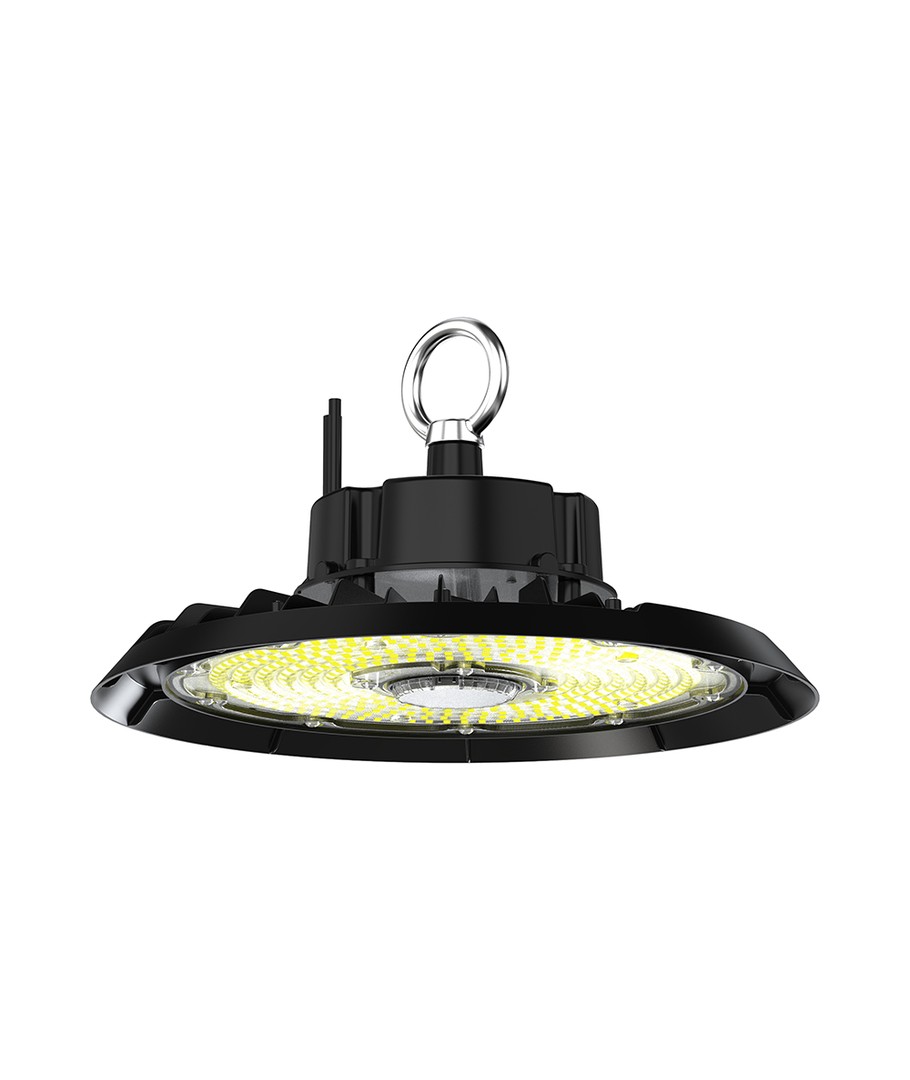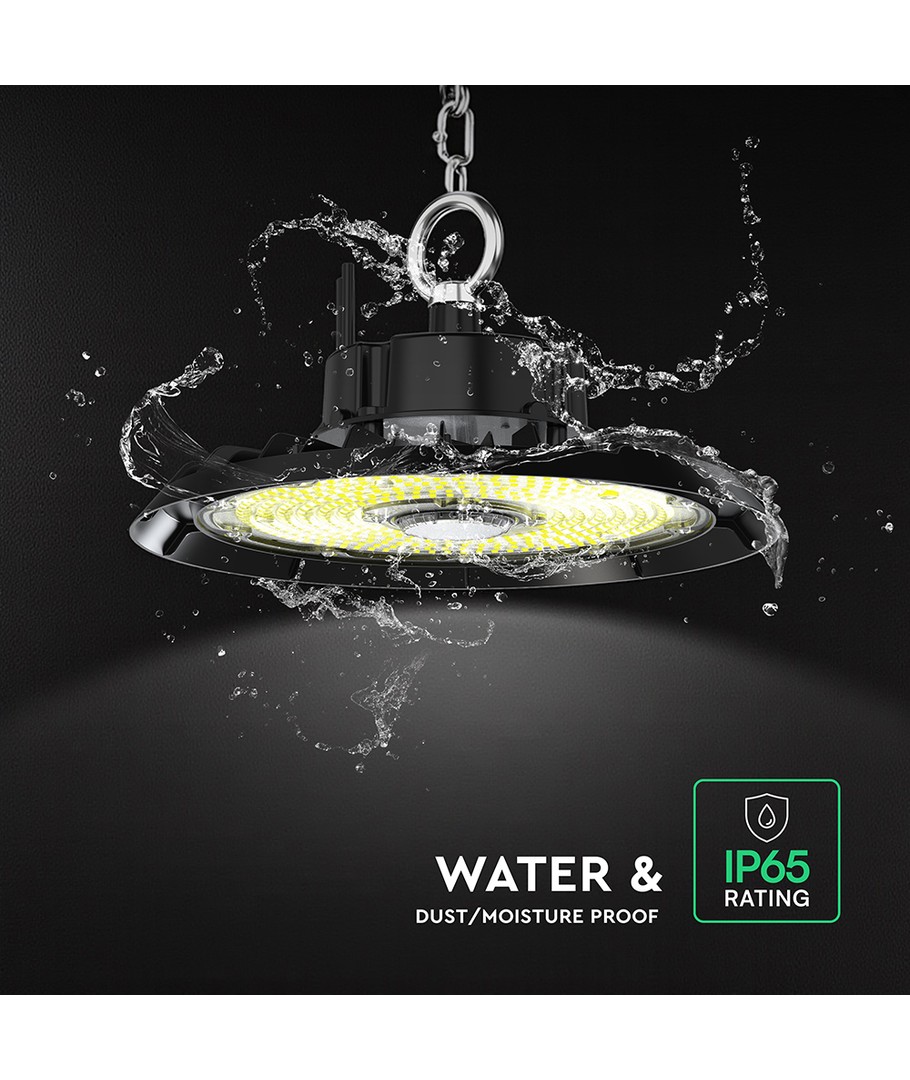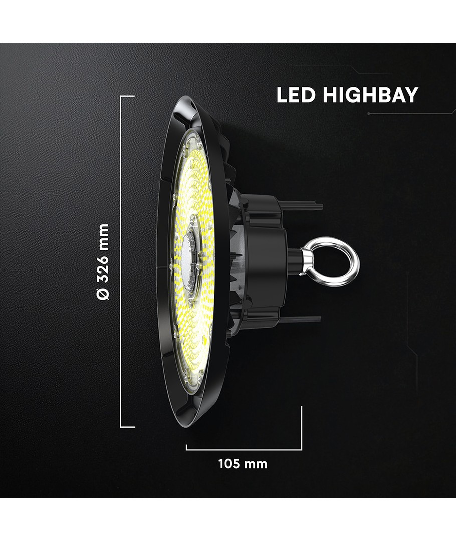 Med en størrelse på 326 x 105 x 326 mm og en solid IP65-klassificering, er denne highbay perfekt til udendørs brug. Den er modstandsdygtig over for vandstænk og regn, hvilket gør den ideel til både indendørs og udendørs installationer.