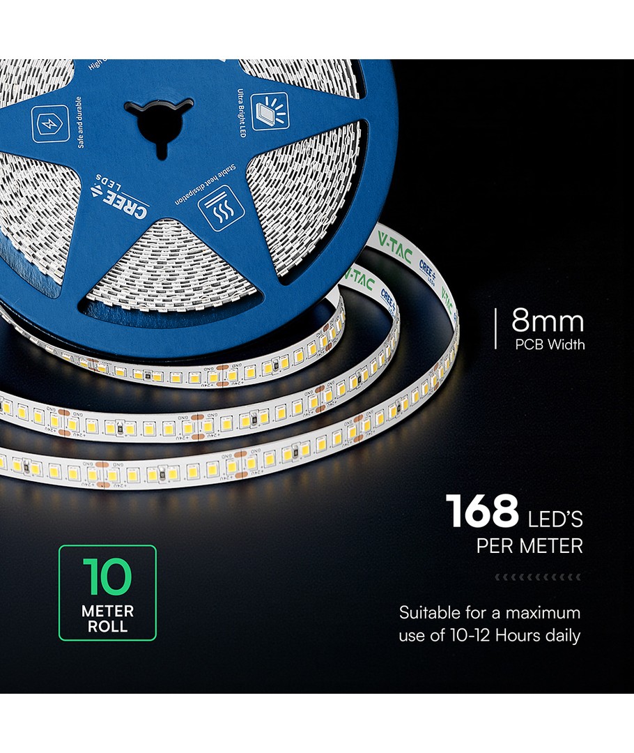 Lysbåndet er udstyret med en Cree chip og opererer ved 12W pr. meter, hvilket gør det både energibesparende og kraftfuldt. Med en kold hvid lystemperatur på 3000K skaber det en varm og indbydende atmosfære i ethvert rum.