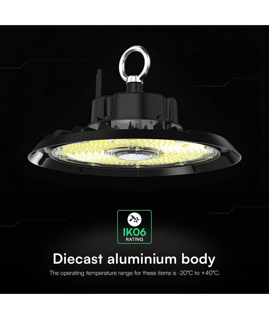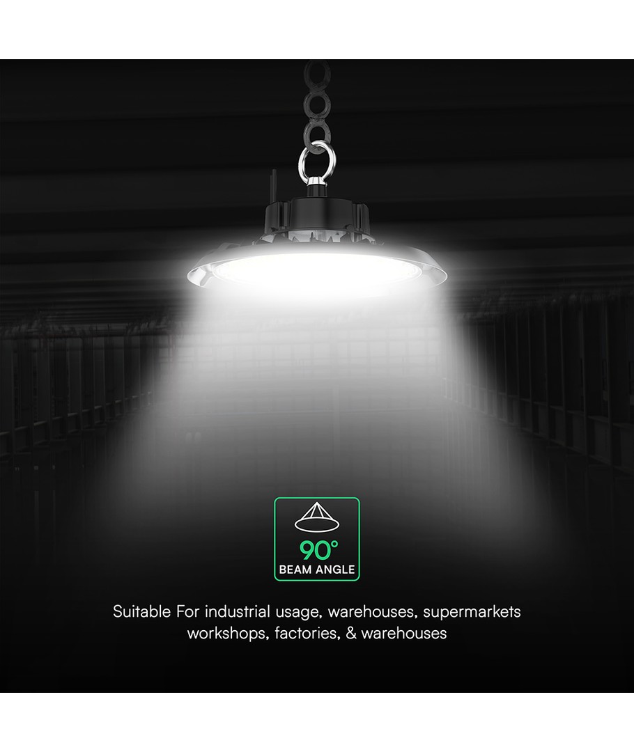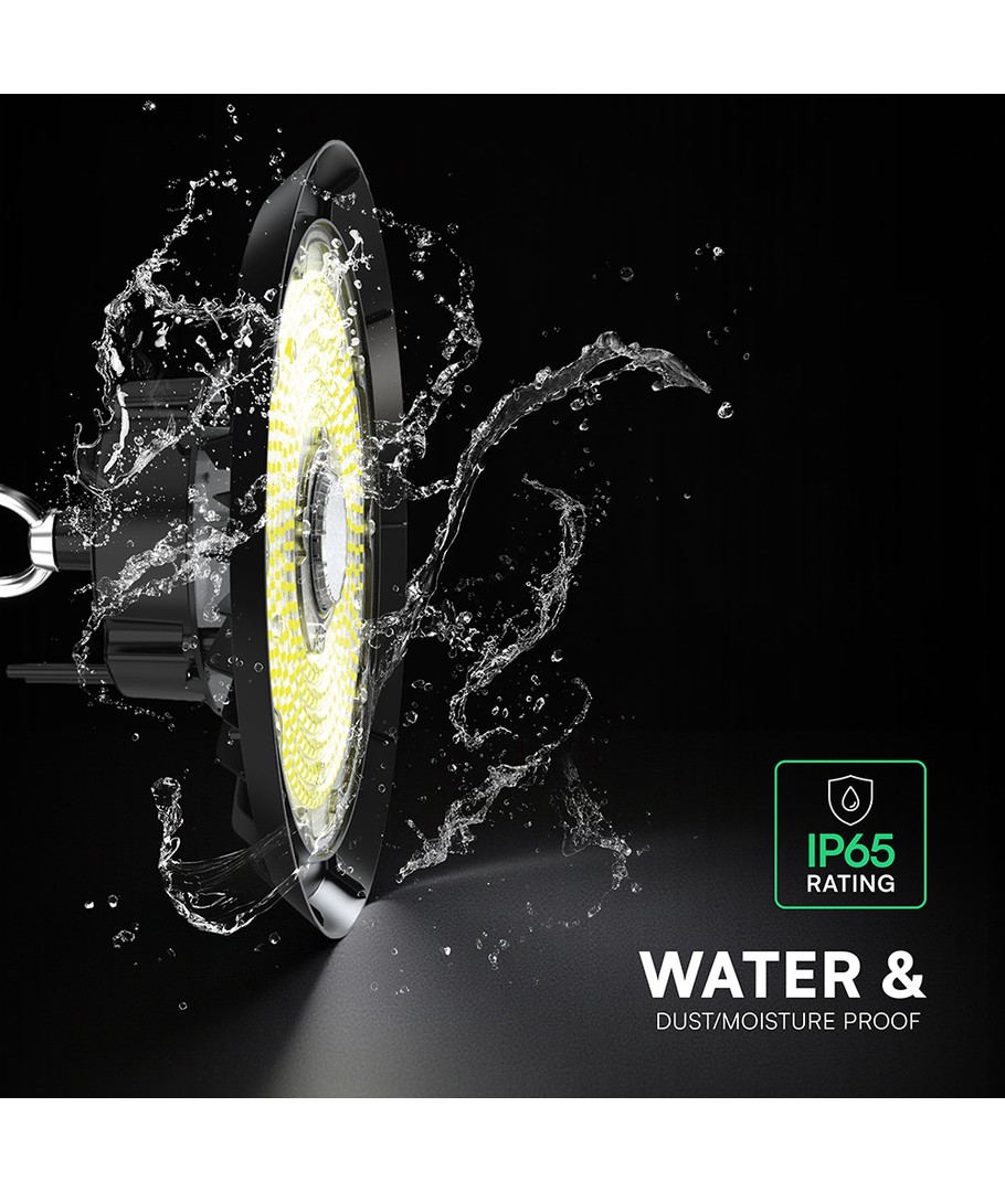 VT-91152 LED highbay er designet til at modstå barske forhold. Med en IP65-klassificering kan den også bruges udendørs, da den tåler både vandstænk og regn. Dette gør den perfekt til en række forskellige indendørs- og udendørsapplikationer.