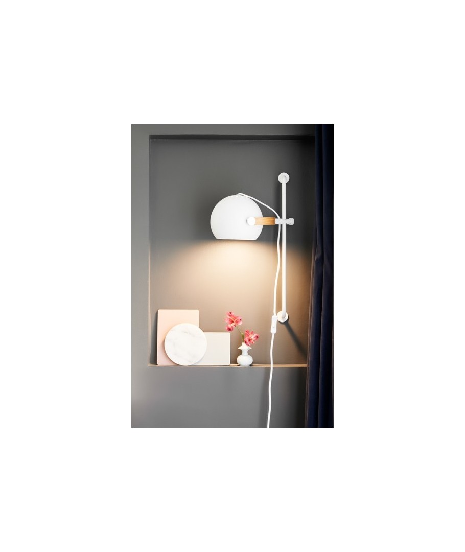 Væglampen er designet med øje for både funktionalitet og æstetik. Den passer perfekt ind i både moderne og klassiske indretninger. Dens elegante kombination af hvidt metal og varm egetræ giver en diskret luksus, der fremhæver de omgivende elementer i din boligindretning.